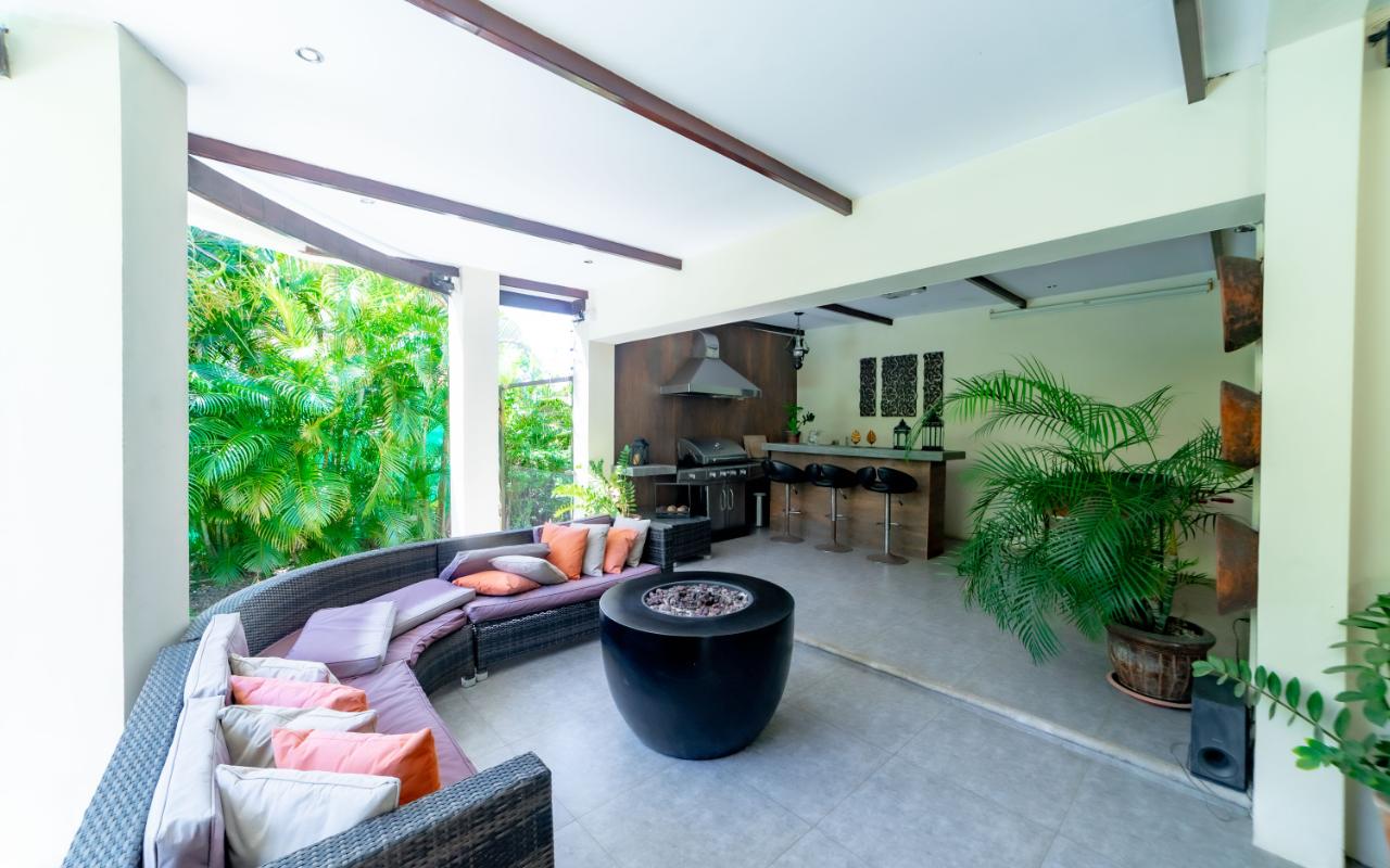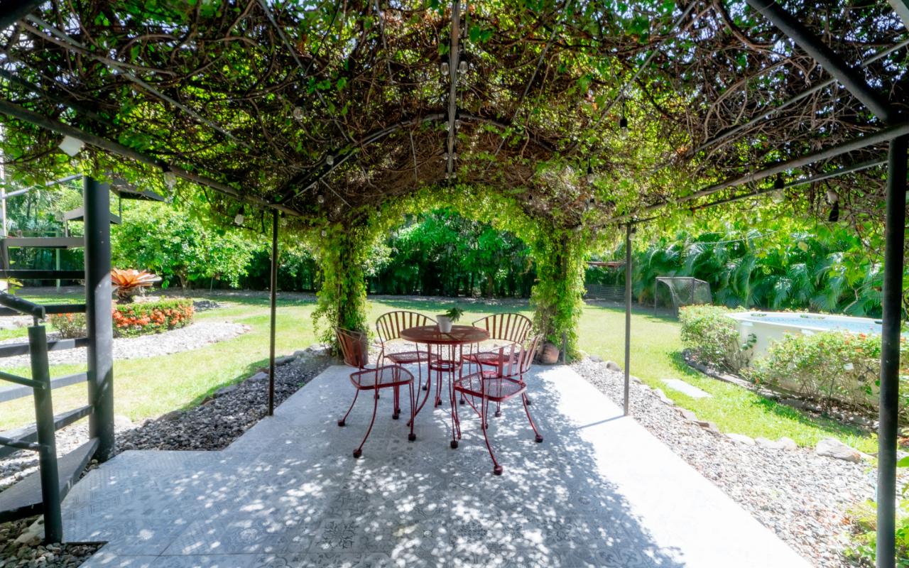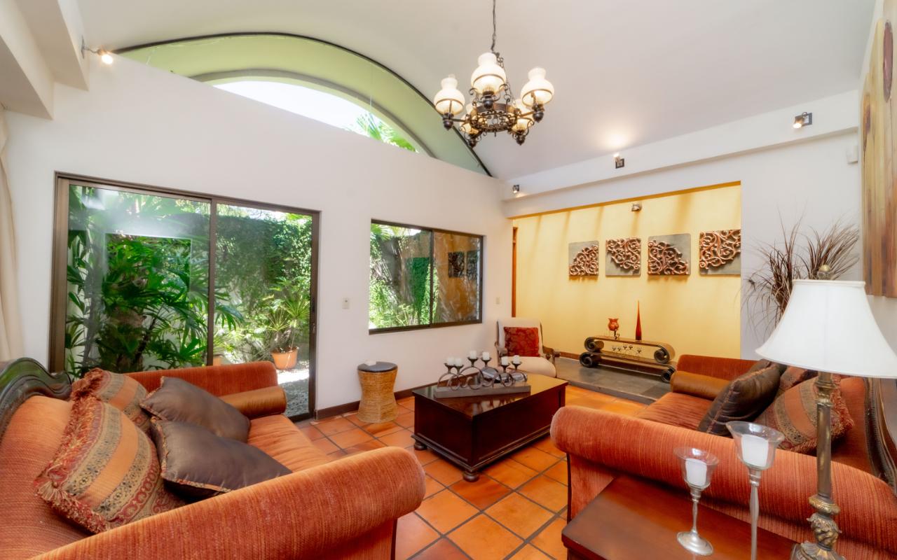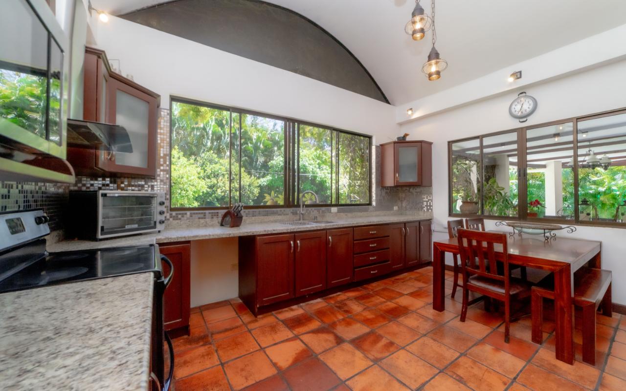 ID# 116720. House for sale or rent in La Guácima, Hacienda Los Reyes condominium, 420 sqm construction, 1.200 sqm land, 5 bedrooms, 4.5 baths, US$685.000 or US$3.500/mo. This magnificent two-story home with traditional architecture and the finest finishes, built in 2012, offers a harmonious blend of comfort, elegance and luxury. Located in an excellent spot within the condominium, it is across the sports areas, so there are no buildings or view obstructions. The home features 5 bedrooms, 4.5 baths, an ample living room and dining room, and beautiful arched ceilings that provide a sense of amplitude. The kitchen is separated, fully furnished with custom wood cabinetry, granite countertopss, and a dinette area. There are floor-to-top windows throughout the house, filling it with natural light and freshness. The terrace and area with pergola overlook the huge gardens. The ourdoors area can be accessed via a spiral staircase from the second floor. The master bedroom also boasts an ensuite bath, a hot tub, and a large walk-in closet. The secondary bedrooms have closet space and view to the garden as well. There’s an ample laundry room and half bath for guest on the first floor. The house also includes a closed garage for 2 vehicles and additional parking space in the driveway. It's the perfect spot for those looking for a luxurious home in a peaceful setting. Hacienda Los Reyes is a 24/7 security residential complex that offers a tranquil and quiet environment, away from all the city noise but at the same time strategically located to be close to all kinds of urban facilities such as supermarkets, shopping centers, schools, banks, restaurants, hospitals, entertainment venues, through easy access roads. The complex has great amenities like pool, ranch, soccer field and ample green areas with orchard and fruit trees.