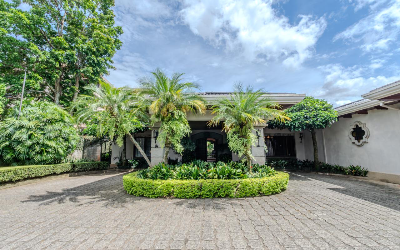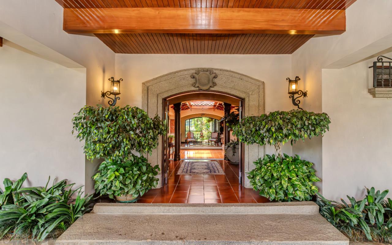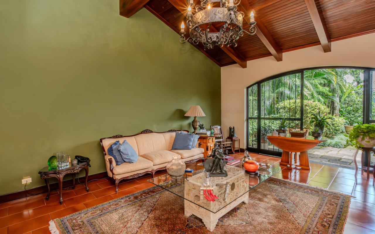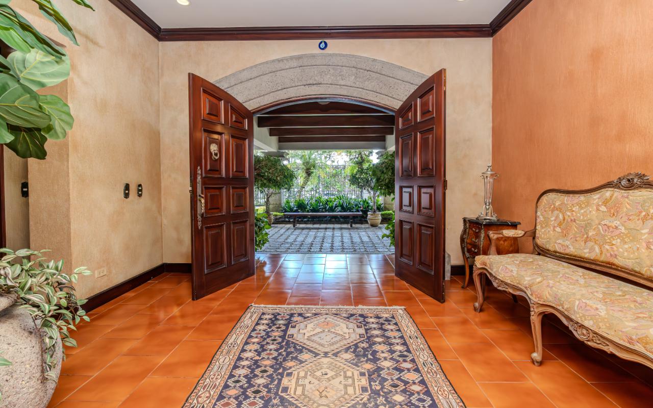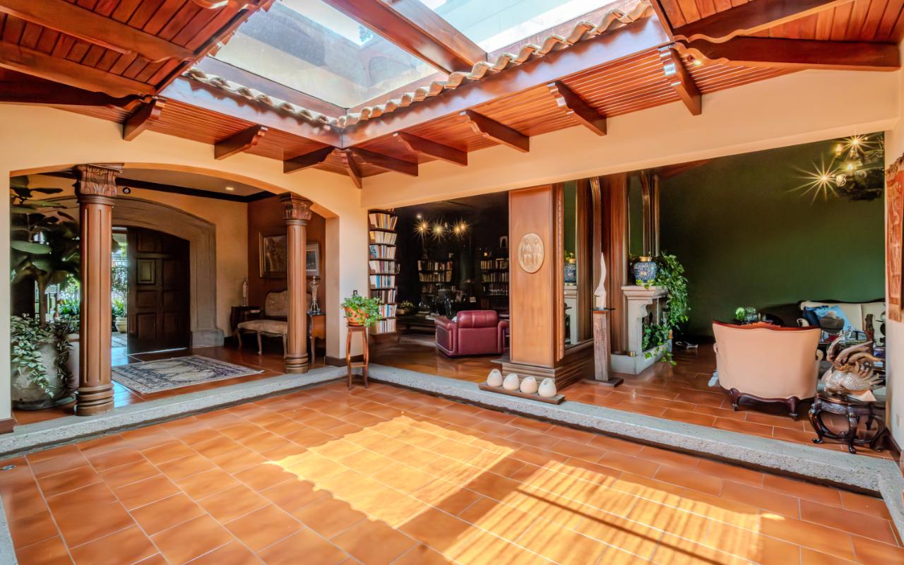 ID# 117425. Private Sale: Prestigious Residence in Curridabat. 633 m² of construction, 1,418 m² of land, 4 bedrooms, 3.5 bathrooms. (Price available upon private request). Located in Curridabat, San José, one of the most exclusive and sought-after residential zones in the eastern sector of the capital, this 633 m² luxury residence on a 1,418 m² lot represents a rare opportunity within the high-end Costa Rica real estate market. Surrounded by lush, mature gardens that guarantee privacy and a deep connection with nature, this property combines neoclassical and colonial-inspired architecture with artisanal craftsmanship, generous interior proportions, and an atmosphere of timeless elegance that defines distinguished living in Curridabat luxury real estate. From the moment you enter, the home reveals its architectural character through an impressive foyer framed by carved wood columns and graceful arches that visually lead toward the main social areas. Double-height ceilings and large windows flood the interiors with natural light while opening panoramic views toward the gardens, creating a seamless indoor-outdoor living experience highly valued in luxury homes for sale in San José, Costa Rica. The main living room offers a warm yet sophisticated ambiance, highlighted by terracotta floors, exposed wooden ceilings, and a large arched window that connects directly to the outdoor terraces and greenery. Adjacent to the social area, a refined library with built-in shelves, decorative moldings, and a central fireplace evokes the elegance of a European residence, offering a private and intimate retreat for reading, work, or contemplation. The formal dining room stands out for its scale and brightness, enhanced by mirrored accents and fine wood finishes that create the perfect setting for entertaining guests and hosting memorable gatherings. The traditional kitchen, designed with solid wood cabinetry and handcrafted ceramic details, offers both functionality and character, reinforcing the home’s warm and family-oriented layout. This prestigious residence includes 4 spacious bedrooms and 3.5 bathrooms, all designed with generous proportions and garden views that ensure comfort, tranquility, and privacy—essential attributes in premium real estate in Curridabat. Outdoor living plays a fundamental role in the property’s design. Covered terraces, open walkways, and mature landscaping surround the home, creating a private oasis in the heart of the city, a highly desirable feature for buyers searching for large properties with land in San José. Strategically located, this home benefits from immediate proximity to Plaza del Sol, Momentum Pinares, Ciudad del Este, top private schools such as SEK International School and Saint Clare College, leading private clinics, supermarkets, fine dining, and fast access to main roads connecting to San Pedro, Escazú, and downtown San José. This privileged location significantly enhances the property’s value within the Costa Rica luxury property market. More than a residence, this is a property of distinction for buyers who appreciate the solidity of classical architecture, expansive land, privacy, and the prestige of owning a home in one of the most desirable neighborhoods of Curridabat, Costa Rica. Confidential pricing available upon request.