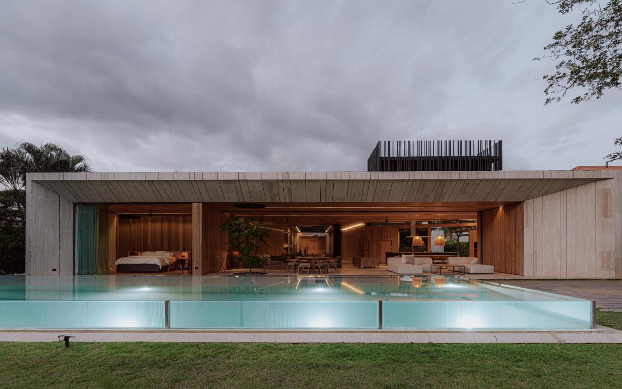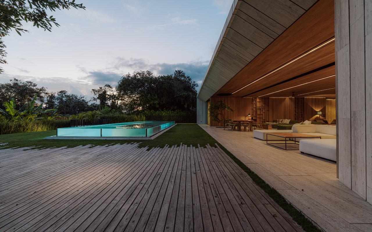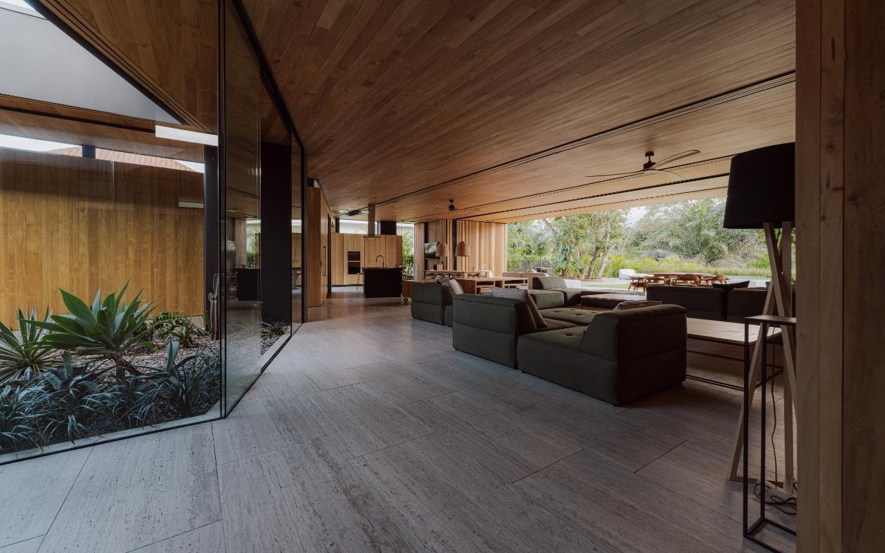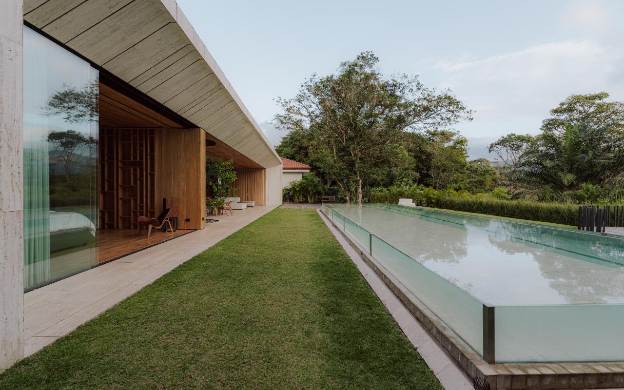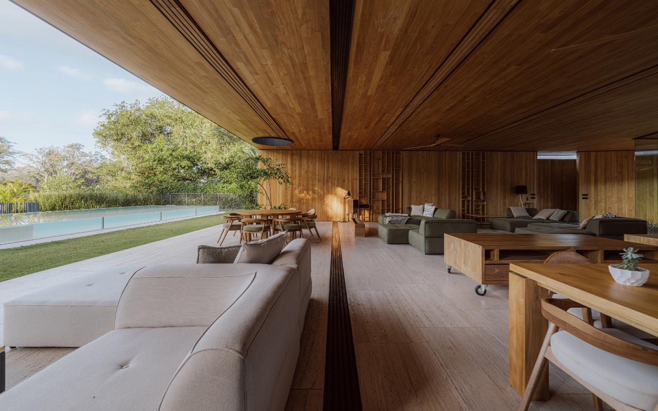 ID# 117469. Single-Level Architectural Masterpiece in Valle del Sol, Costa Rica. I 1,504 m² lot I 1,255 m² total construction. (INQUIRE PRIVATELY FOR PRICING). This is not a house. This is a statement. Set on a 1,504 m² lot with 1,255 m² of total construction, Casa Brutale stands among the most architecturally significant residences ever offered for sale in Valle del Sol, Santa Ana—the premier golf community on the west side of San José. Conceived on one single level with zero steps (only a teak sky deck above), the home captures elevated, uninterrupted views over the protected golf course green area and lake, delivering rare privacy, visual scale, and a constant connection with nature that defines Costa Rica real estate at its finest. The architectural language pays homage to Ludwig Mies van der Rohe and the iconic Barcelona Pavilion. Exterior façades and interior floors are wrapped in Italian travertine marble, while light wood walls and ceilings add warmth and acoustic elegance. Custom shelving subtly references the geometric compositions of Piet Mondrian. The result is a residence where architecture, art, and materials become the living experience. The layout features six en-suite bedrooms, three with walk-in closets, including a private guest wing with independent access, two suites, and its own TV lounge. The primary suite (approx. 105 m²) operates as a private spa, with soaking tub, dual showers, dual vanities, dual toilets, two walk-in closets, plus an outdoor jacuzzi and shower immersed in greenery. A dramatic interior courtyard anchors the home, flooding every space with natural light and enabling ideal cross-ventilation for Costa Rica’s climate. Above it, a cantilevered office floats with direct views to the golf course. The social core is defined by two designer kitchens with SMEG appliances and a one-of-a-kind custom island. A full staff apartment for two connects seamlessly to the secondary kitchen. Amenities continue with a large TV lounge featuring a retractable floor-rising TV, gym, sauna, wine cellar, storage rooms, toys room, and a signature BBQ social area. Outdoors, teak defines the lifestyle through a circular river/yoga deck, 100 m² and 20 m² garden decks, and a 360° panoramic sky deck. The centerpiece is a glass infinity pool overflowing on all four sides (15.7 × 4.7 m) with swim lane, integrated bathtub, and solar heating maintaining water temperatures between 28–31°C year-round. LED lighting throughout, solar hot water, and covered parking for 4–5 cars plus 3 motorcycles complete the property’s technical excellence. Located minutes from Route 27, Escazú, top private schools, leading clinics, fine dining, and just 30 minutes from Juan Santamaría International Airport (SJO), Casa Brutale is a true collector’s residence within the Valle del Sol golf community—crafted for buyers who understand architecture, scale, privacy, and the rarity of owning a landmark home in Santa Ana real estate.